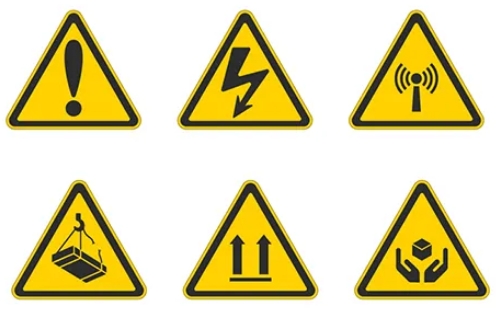 Generalmente, estas señales tienen forma triangular, fondo amarillo y símbolos en color negro. En trabajos en altura, se utilizan para advertir sobre riesgos como: