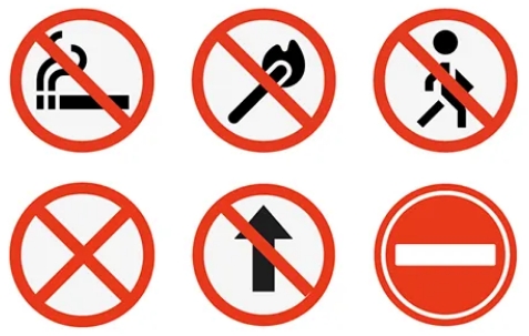 Estas señales suelen ser de forma circular, con fondo blanco, borde rojo y símbolo negro con una línea diagonal roja. En trabajos en altura, algunas de las más comunes son: